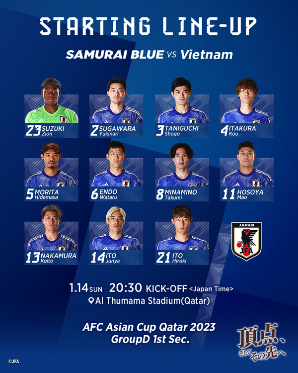 일본은 14일 오후 8시30분(한국시간) 카타르 도하의 알 투마마 스타디움에서 열린 베트남과 '2022 아시아축구연맹(AFC) 아시안컵' 조별리그 D조 1차전에서 4-2로 승리했다. 대회 첫 승을 올린 일본은 조 1위로 올라섰다.