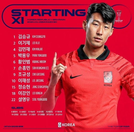 클린스만 감독도 이를 모를 리 없었다. 조 1위를 차지해야 토너먼트 일정이 수월해지는 만큼 첫 경기부터 총력전을 택했다. 손흥민과 김민재, 이강인 등 핵심 멤버들이 총 출격했다. 포메이션은 4-4-2였다. '캡틴' 손흥민과 함께 조규성(미트윌란)이 투톱을 맡았다. 왼쪽 측면은 이재성(마인츠), 오른쪽 측면에는 이강인이 배치됐다. 황인범(츠르베나 즈베즈다), 박용우(알아인)이 중앙 미드필더로 출전했다. 포백 라인은 이기제(수원삼성), 김민재, 정승현(울산HD), 설영우(울산HD)였다. 골키퍼 장갑은 김승규(알샤밥)가 꼈다.