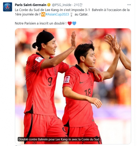 PSG는 16일(한국시간) 공식 소셜네트워크서비스(SNS)에 "이강인의 활약에 힘입어 한국이 아시안컵 첫 승을 거뒀다"고 축하글을 게재했다. 이어 한 시간 뒤 다시 이강인이 골을 넣고 기뻐하는 사진을 올리며 "우리 파리지앵이 멀티골을 터트렸다"고 기뻐했다.