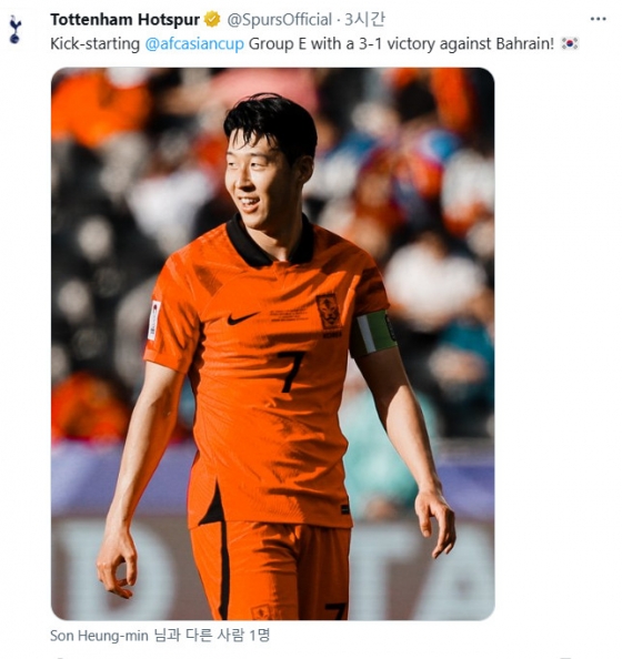 '주장' 손흥민의 소속팀 토트넘도 한국의 승리를 축하했다. 토트넘은 바레인전 킥오프 전 "주장은 준비됐다"라는 글과 함께 비장한 표정의 손흥민을 공개했다. 이어 "한국이 아시안컵 조별리그 E조에서 승리를 거뒀다"며 손흥민이 웃고 있는 사진을 올렸다.