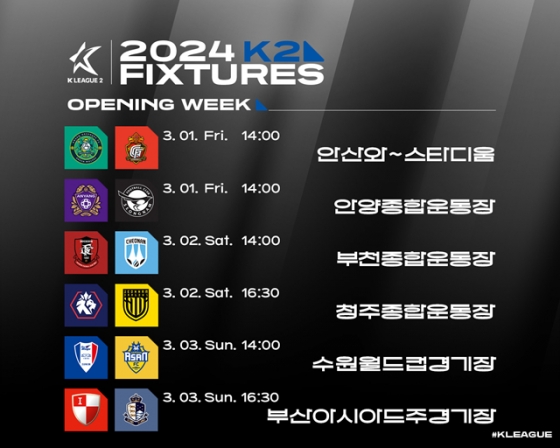 한국프로축구연맹이 2024시즌 K리그2 정규라운드 1라운드부터 39라운드까지의 일정을 발표했다.