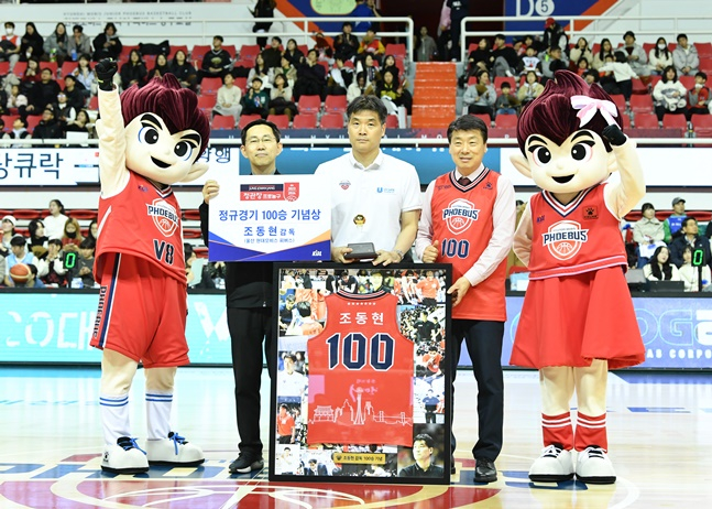 이날 경기 전에는 조동현 감독의 통산 100승 시상식이 열렸다. KBL 역대 20번째 기록이다. 지난 2015~2016시즌 부산 KT 소닉붐(현 수원 KT) 사령탑으로 부임한 조 감독은 첫 시즌 23승, 2016~2017시즌 18승, 2018~2019시즌 10승을 거뒀다. 이어 2022~2023시즌 현대모비스의 감독으로 승격한 그는 지난해 34승을 올렸고, 18일 SK전에서 시즌 15승째를 올리며 이정표를 달성했다. 경기 전 조 감독은 "개인 기록이 중요하겠나. 앞선 팀부터 지금까지 선수들과 코치진, 사무국의 도움이 있었다"고 공을 돌렸다.