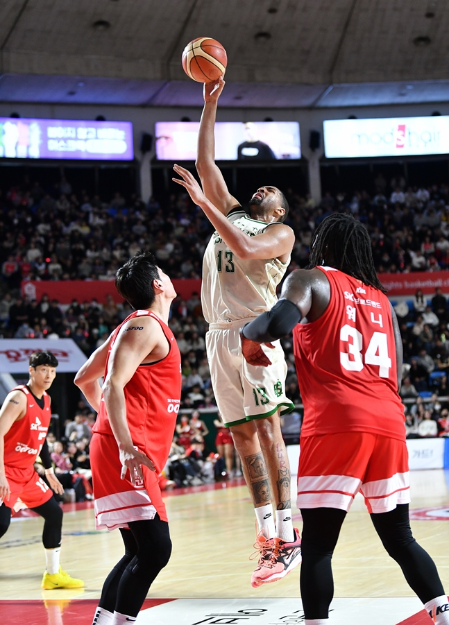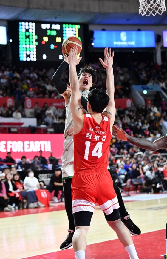 서울 SK 나이츠가 20일 잠실학생체육관에서 열린 '2023~2024 정관장 프로농구 정규리그'에서 원주 DB 프로미를 76-68로 꺾었다. 2연패를 끊은 SK는 23승10패로 선두 DB를 4경기 차로 추격했다. 이날 잠실학생체육관은 만원 관중을 기록했다. SK에 일격을 당한 DB는 3연승을 마감하며 26승7패를 기록했다.