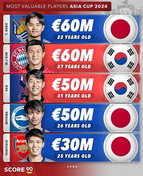 앞서 스포츠 전문 스코어90은 카타르 아시안컵에서 활약하는 선수들 중 몸값이 가장 높은 선수 5명을 소개했다. 쿠보와 함께 대한민국의 괴물 수비수 김민재(바이에른 뮌헨)가 1위를 기록했다. 두 선수의 몸값은 6000만 유로(약 870억 원)였다.