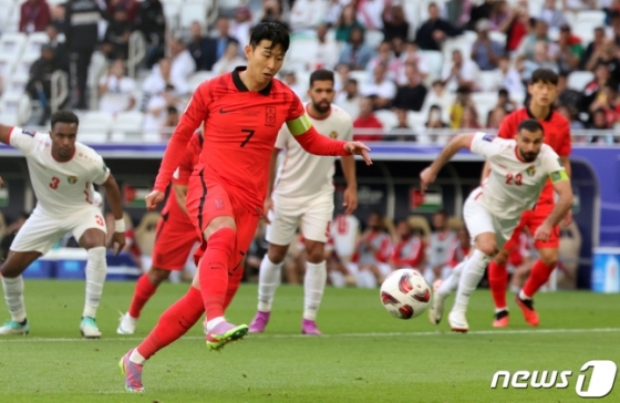 키커로 나선 손흥민은 오른발 슈팅으로 톡 찍어 차 득점에 성공했다. 본인의 아시안컵 1호 득점이다. 한국이 요르단을 상대로 1-0으로 앞서고 있다.