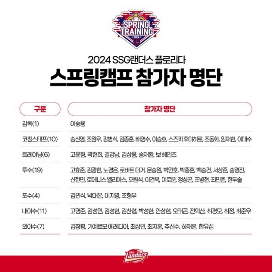 SSG는 "1월 30일부터 3월 7일까지 미국 플로리다와 대만 자이에서 스프링캠프를 실시한다"고 24일 발표했다.