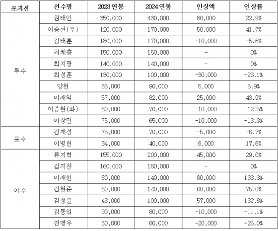 또 주전 외야수로 활약한 김현준이 1억4000만원, 김성윤이 1억원에 계약하며 데뷔 첫 억대 연봉을 받게 됐다.