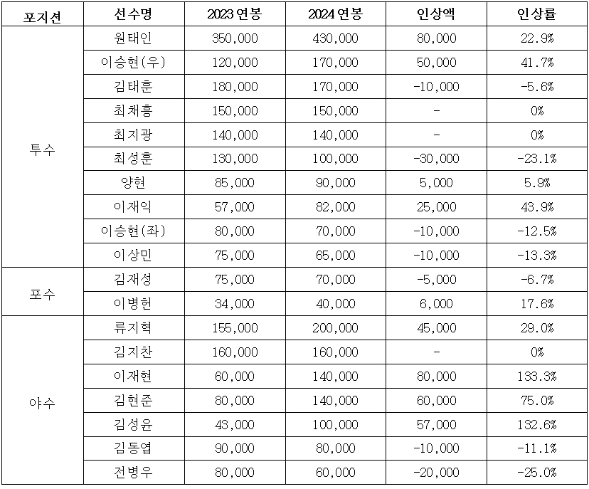먼저, 지난 시즌 두 자릿수 홈런을 치며 인상적인 시즌을 보낸 이재현이 기존 연봉에서 133.3% 인상된 1억4000만원에 계약, 팀 내 최고 연봉 인상률을 기록했다.
