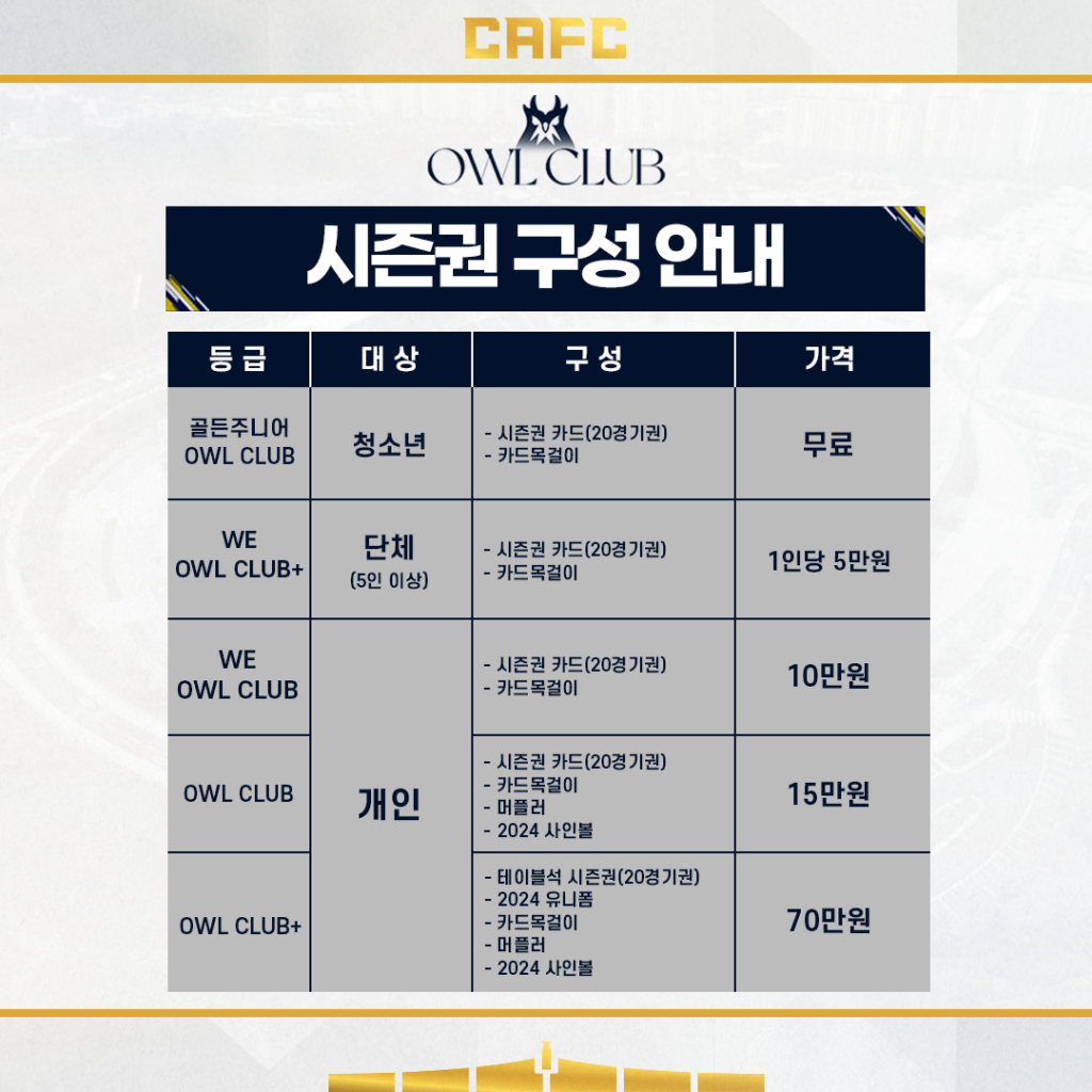 프리미엄 시즌권인 OWL CLUB+는 FA컵을 포함한 전 경기 테이블석으로 제공되며 시즌 내내 지정한 고유 좌석에서 경기를 관람할 수 있다. 이외에도 2024시즌 유니폼, 카드목걸이, 머플러, 사인볼을 증정할 계획이다. OWL CLUB과 WE OWL CLUB은 원정석을 제외한 일반석 전 구역에 착석 가능하며 OWL CLUB의 경우 카드목걸이, 머플러, 사인볼을 제공한다.