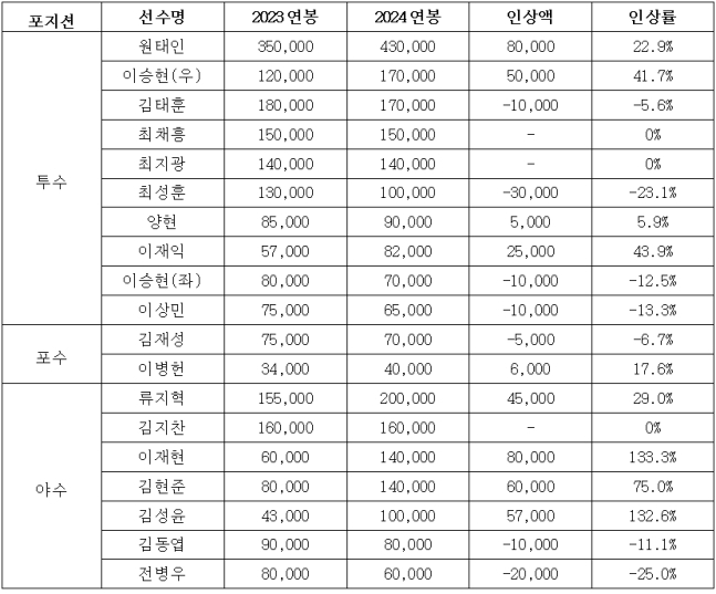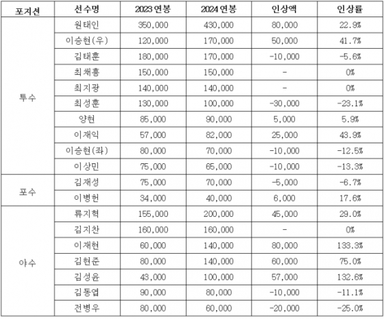 이재현은 이번 명단에서 최고 인상률을 기록했다. 6000만원에서 133.3%, 8000만원으론 1억 4000만원.