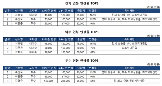 가장 눈에 띄는 이름은 서호철(28)이다. 지난해 4500만 원의 연봉을 받았던 그는 올해 167% 상승한 1억 2000만 원을 받는다. 2019년 프로 입단 후 5년 만에 처음으로 억대 연봉에 진입했다. 서호철은 지난해 타율 0.287(435타수 114안타), 5홈런 41타점 50득점 4도루, 출루율 0.331, 장타율 0.383, OPS 0.714의 성적을 거뒀다. 한때 타격왕 경쟁을 할 정도로 좋은 타격감을 뽐냈고, 포스트시즌에서도 활약하며 팀의 '가을 돌풍'에 힘을 보탰다.
