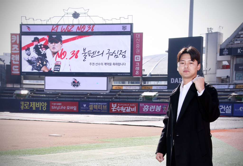 KT 위즈는 26일 "투수 주권과 2+2년 최대 16억원(계약금 2억원, 연봉 총액 12억원, 인센티브 2억원)에 FA 계약을 체결했다. 첫 2년 계약의 총액은 7억원이고, 이후 2년은 9억원의 성적 옵션이 포함된 조건"이라고 공식 발표했다.