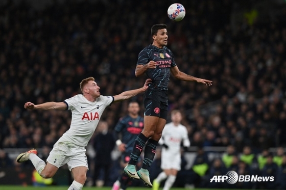 토트넘은 27일(한국시간) 영국 런던의 토트넘 핫스퍼 스타디움에서 열린 '2023~2024 잉글랜드축구협회(FA컵)' 4라운드(32강) 홈 경기에서 맨시티에 0-1로 패했다. 토트넘이 맨시티에 패한 것은 2018년 10월 이후 6년 만이다. 사진은 로드리. /AFPBBNews=뉴스1