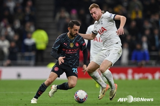 토트넘은 27일(한국시간) 영국 런던의 토트넘 핫스퍼 스타디움에서 열린 '2023~2024 잉글랜드축구협회(FA컵)' 4라운드(32강) 홈 경기에서 맨시티에 0-1로 패했다. 토트넘이 맨시티에 패한 것은 2018년 10월 이후 6년 만이다. 사진은 베르나르두 실바(왼쪽)와 데얀 클루셉스키. /AFPBBNews=뉴스1