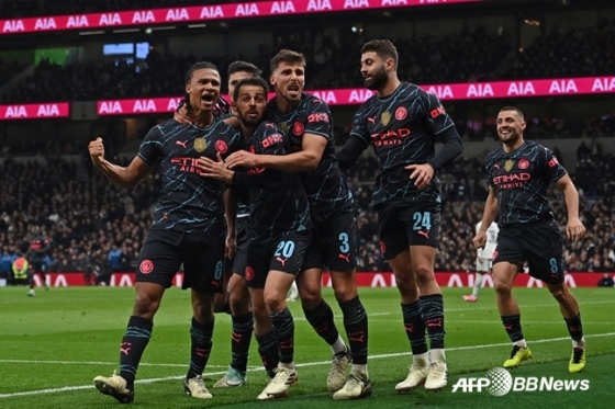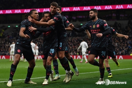 토트넘은 27일(한국시간) 영국 런던의 토트넘 핫스퍼 스타디움에서 열린 '2023~2024 잉글랜드축구협회(FA컵)' 4라운드(32강) 홈 경기에서 맨시티에 0-1로 패했다. 토트넘이 맨시티에 패한 것은 2018년 10월 이후 6년 만이다. 사진은 결승골을 넣고 기뻐하는 맨시티 선수들. /AFPBBNews=뉴스1