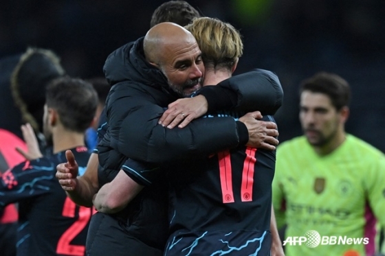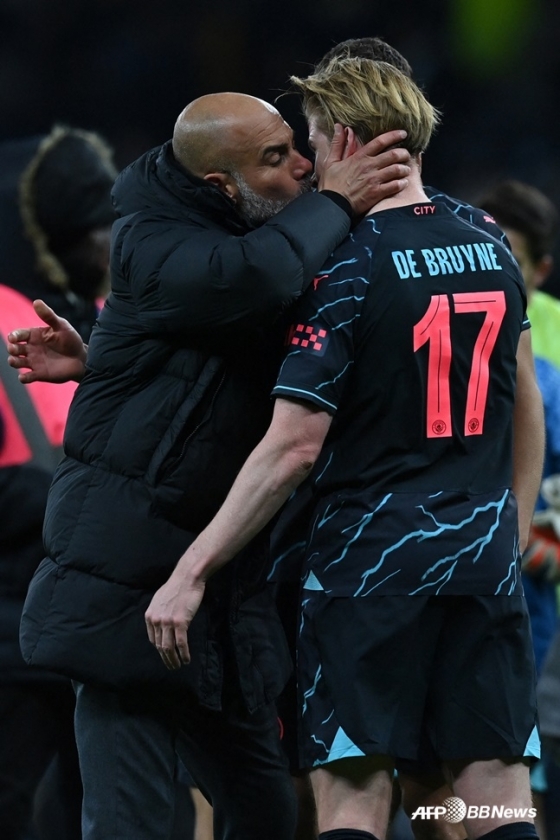 토트넘은 27일(한국시간) 영국 런던의 토트넘 핫스퍼 스타디움에서 열린 '2023~2024 잉글랜드축구협회(FA컵)' 4라운드(32강) 홈 경기에서 맨시티에 0-1로 패했다. 토트넘이 맨시티에 패한 것은 2018년 10월 이후 6년 만이다. 사진은 펩 과르디올라 감독과 케빈. 데 브라위너. /AFPBBNews=뉴스1