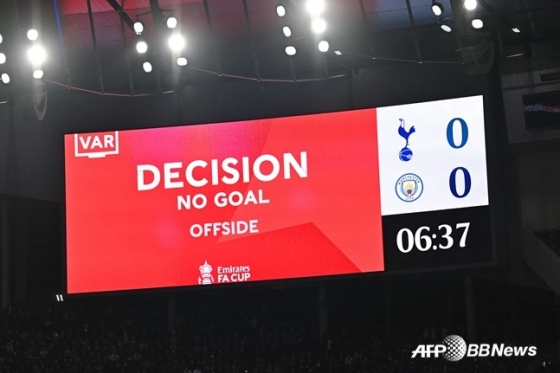 토트넘은 27일(한국시간) 영국 런던의 토트넘 핫스퍼 스타디움에서 열린 '2023~2024 잉글랜드축구협회(FA컵)' 4라운드(32강) 홈 경기에서 맨시티에 0-1로 패했다. 토트넘이 맨시티에 패한 것은 2018년 10월 이후 6년 만이다. 사진은 토트넘-맨시티 경기 전광판. /AFPBBNews=뉴스1
