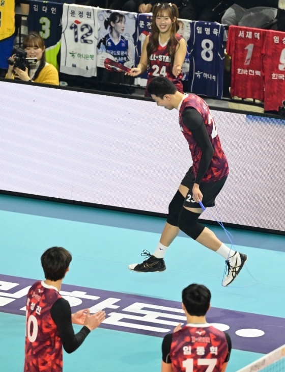 남자부 선수들이 나선 1세트 경기에서 신영석은 그 약속을 지켰다. 38세의 베테랑임에도 최근 SNS를 통해 엄청난 인기를 모았던 슬릭백 세리머니를 완벽하게 선보이며 팬들의 감탄을 자아냈다.