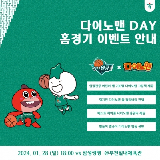 28일 다이노맨 데이 이벤트 내용은 하나원큐 구단 SNS를 통해 확인할 수 있으며, 홈 경기 예매는 WKBL 홈페이지 및 WKBL 애플리케이션 예매 또는 당일 경기장 현장 구매 가능하다.