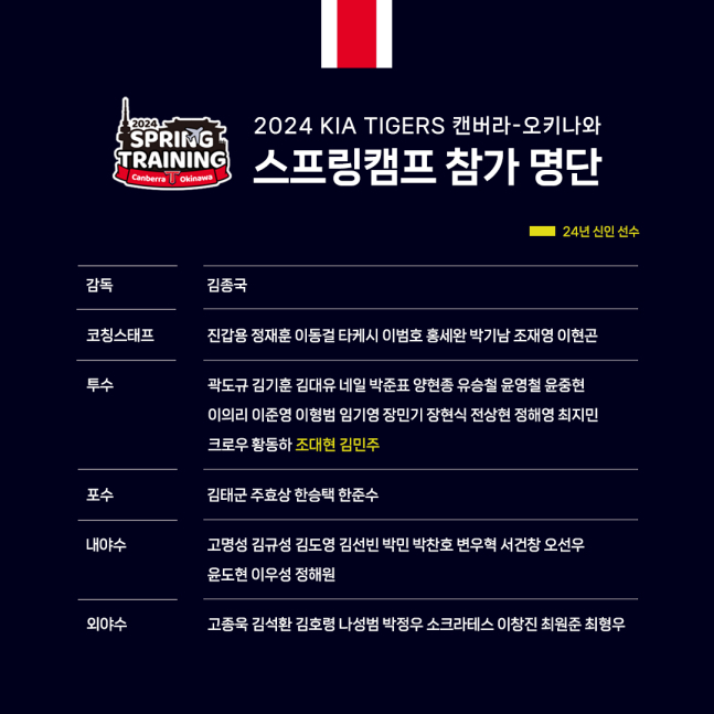 스프링캠프 출국을 이틀 앞둔 상황에서 나온 충격적인 소식이다. 올해 스프링캠프를 호주 캔버라(1차)와 일본 오키나와(2차) 두 곳에서 연달아 여는 KIA는 30일 오후 8시 인천국제공항을 통해 시드니로 떠날 예정이었다. 이번 스프링캠프에는 코칭스태프 20명, 선수 47명 등 67명의 선수단이 참가한다. 선수단은 투수 22명, 포수 4명, 내야수 12명, 외야수 9명으로 구성됐다. 2024년 신인 가운데에서는 투수 조대현과 김민주가 명단에 이름을 올렸다. 그에 앞서 코칭스태프는 1월 29일 오후 8시 같은 비행기편으로 하루 먼저 호주로 이동할 예정이었으나, 이 명단에서 김종국 감독은 빠지게 됐다.