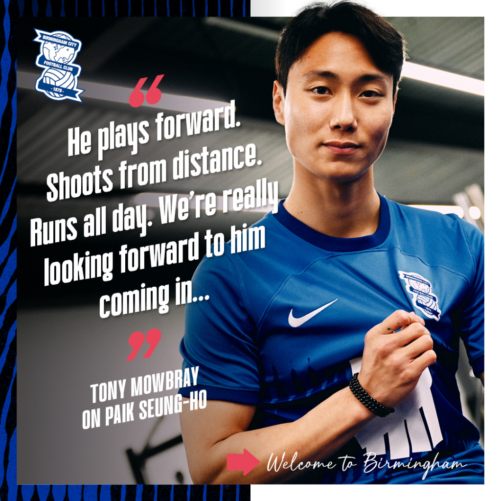 구단이 공개한 사진에 따르면 백승호는 이미 토니 모브레이(61) 버밍엄 감독과 훈련장에서 만났다. 모브레이 감독은 입스위치 타운, 하이버니언FC, 웨스트브롬위치 알비온, 셀틱, 미들즈브러, 선덜랜드 등 다양한 팀을 지도하며 영국 지역에서 잔뼈가 굵은 지도자로 잘 알려졌다.