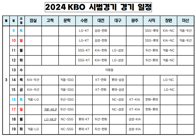 한국야구위원회(KBO)는 30일 2024 KBO 시범경기 일정을 발표했다. 이에 따르면 올해 시범경기는 오는 3월 9일부터 19일까지 팀당 10경기를 치르며, MLB 서울 개막전에 앞서 연습경기를 벌이는 LG와 키움은 각각 8경기로 총 48경기가 편성됐다.