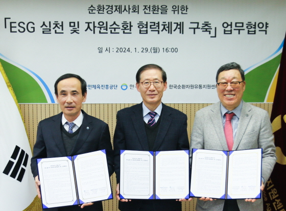 서울올림픽기념국민체육진흥공단은 지난 29일 한국환경공단, 한국순환자원유통지원센터와 ESG 실천 및 자원순환 협력체계 구축을 위한 3자 업무협약을 체결했다.