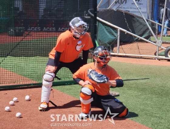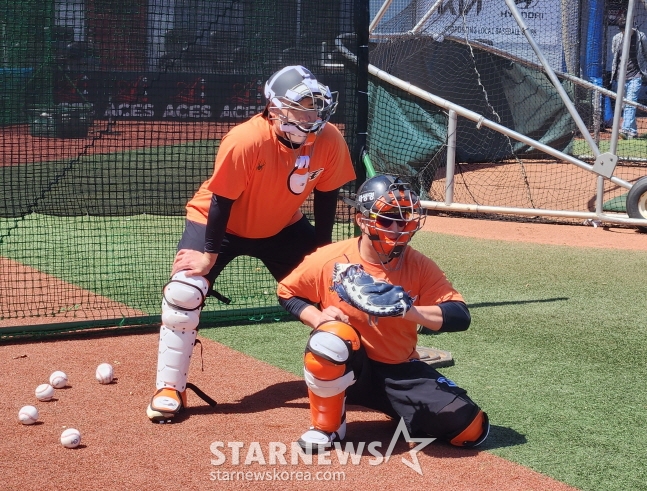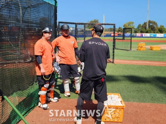 김 코치는 피칭 머신을 활용해 다양한 훈련을 이끌었다. 구속과 구종, 코스를 달리하며 다양한 상황에서 효과적으로 포구할 수 있는 방법에 대해 지도했고 김 코치의 목소리가 훈련장에 연신 울려퍼졌다. 두 포수는 까다로운 코스의 공에 고개를 가로저으면서도 이내 적응하고 김 코치의 기대에 부응했다.