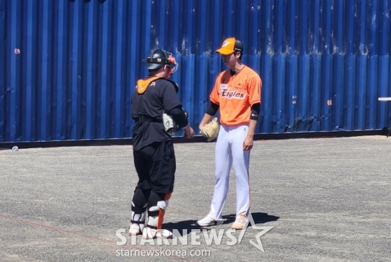 최원호 감독과 손혁 단장을 비롯해 취재진까지 이들의 손 끝에 시선을 집중했다. 지난해 신인왕을 차지한 문동주는 가장 먼저 투구를 마쳤다. 공을 받은 이재원과 한참을 얘기한 뒤 꾸벅 인사를 하고 먼저 빠져나갔다. 이제는 마운드의 상수가 된 토종 에이스다.