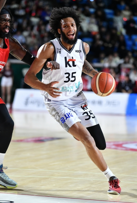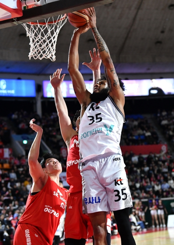 KT는 3일 잠실학생체육관에서 열린 '2023~2024 정관장 프로농구' 정규리그에서 서울 SK나이츠를 78-76으로 꺾었다. '3위 싸움'으로 관심을 모은 이날 승자는 KT였다. 4쿼터 초반 12점 차까지 뒤졌지만 대역전극을 만들며 만원 잠실 관중(5206명)에 찬물을 끼얹었다. 2연승을 달린 KT는 24승13패로 창원 LG 세이커스와 공동 2위로 올라섰다.