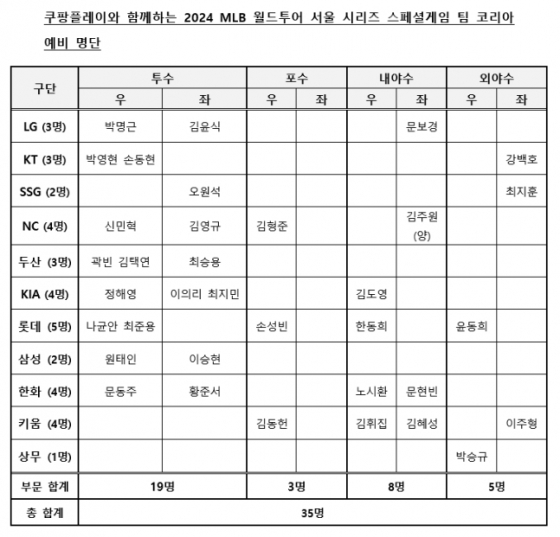 지난 2일 발표된 예비명단에는 35명의 선수가 포함됐는데, 투수 19명, 포수 3명, 내야수 8명, 외야수 5명으로 구성했으며, 팀 별로는 롯데가 가장 많은 5명, NC, KIA, 한화, 키움 각각 4명, LG, KT, 두산 3명, SSG, 삼성 2명, 상무에서 1명이 대표팀에 이름을 올렸다. 지난해 한국 국가대표 경기를 챙겨본 야구팬이라면 익숙한 얼굴들이다. 대표팀 주장 김혜성(25·키움 히어로즈), 에이스 문동주(21), KBO 홈런왕 노시환(24·이상 한화 이글스), '제2의 김하성' 김주원(22), '차세대 안방마님' 김형준(25·NC 다이노스) 등 아시안게임 금메달 주역부터 최지민(21), 김도영(21·이상 KIA) 등 APBC 준우승 멤버까지 화려하다.