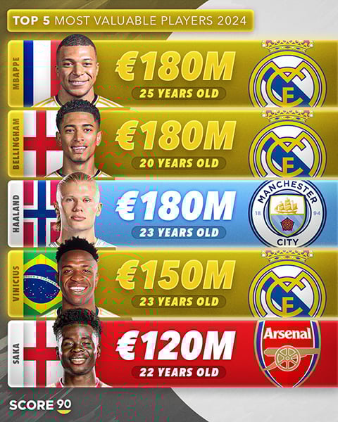 ‘score90’은 글로벌 이적시장 사이트 ‘트랜스퍼마켓’을 참고했다. 2024년 몸값이 가장 높은 선수는 음바페, 주드 벨링엄, 엘링 홀란이었다. ‘트랜스퍼마켓’에 의하면 세 선수의 가치는 1억 8000만 유로(한화 약 2569억 원)였다.