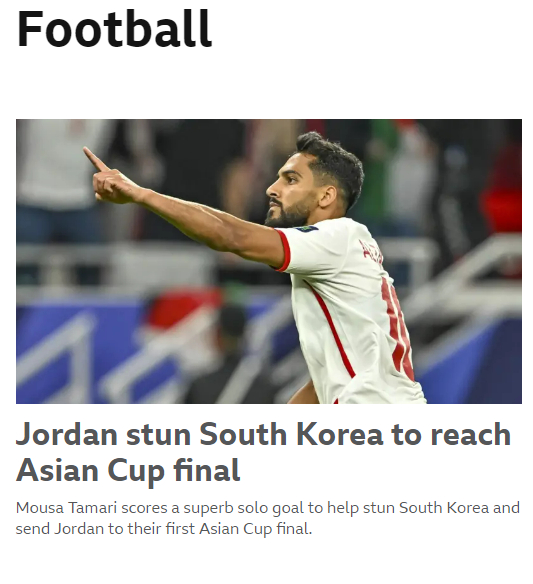 요르단은 한국의 조별리그 2차전 상대였다. 당시에는 2-2로 비겼다. 4강 경기는 달랐다. 비록 핵심 수비수 김민재(바이에른 뮌헨)가 경고 누적으로 결장했다고는 하나, 변명할 수 없는 역대급 졸전이었다. 'BBC'는 "김민재가 결장한 가운데 한국은 전반전 요르단의 강한 전방 압박에 고전했다"라며 "야잔 알나이마트(알 아흘리)는 침착한 슈팅으로 조현우(울산HD)를 제압했다. 무사 알타마리(몽펠리에)는 13분 뒤 한국 수비를 제치고 낮은 슈팅으로 골망을 갈랐다"라고 설명했다.