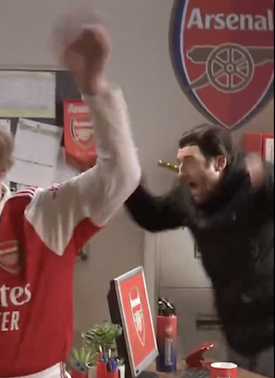 이후 아르테타 감독을 분장한 남성이 종이를 구긴 뒤 쓰레기통에 던졌고, 종이가 한 번에 쓰레기통에 들어가자 갑자기 사람들이 몰려나와 환호하는 모습이 담겼다. 아스널의 세리머니를 조롱하는 영상이었다.