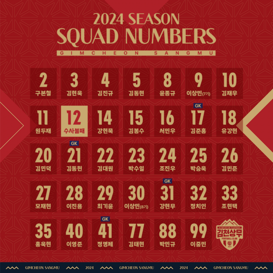 [스포탈코리아] 한재현 기자= 김천상무가 8일 ‘2024시즌 선수단’ 배번을 발표했다.