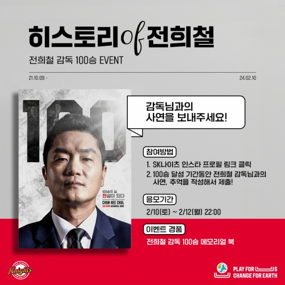 이에 SK 구단은 KBL 최소 경기 100승을 달성한 전희철 감독을 기념하는 특별 이벤트를 실시한다. 우선 SK는 오는 15일 오후 7시에 열리는 창원 LG와 홈경기에서 100승 달성 세레머니를 진행한다. 또 SK는 전 감독의 100승 달성을 기념해 팀 인스타 계정을 통해 전 감독과의 개인적인 사연 혹은 특별한 스토리를 공모한다. 응모한 팬 중 100명에게는 한정판으로 제작한 메모리얼 북『100승의 길, 전설이 되다』를 증정한다. 『100승의 길, 전설이 되다』는 전희철 감독이 기록한 첫 승부터 100승까지 전 경기에 대한 간략한 평가 및 전희철 감독의 승리 코멘트 등을 삽입해 만든 포토북이다.