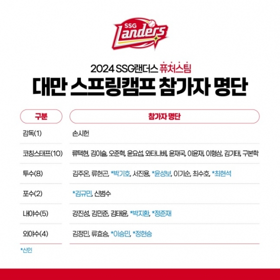 2020년 미국 플로리다 캠프 이후 4년 만에 퓨처스팀 해외 스프링캠프이며, 손시헌 퓨처스 감독을 포함해 11명의 코칭스태프와 선수 19명 등 총 30명의 선수단이 참가한다. SSG는 2군 선수들의 동기부여를 위해 1군 선수들의 2차 캠프지를 동일하게 사용, 대만에서 1, 2군 간 선수이동 및 교류를 강화할 뜻을 밝혔다. 또한 SSG 퓨처스팀은 선수단의 빠른 실전 감각 향상과 기량 발전을 위해 대만 프로야구팀과 총 5차례 연습경기를 가진다.