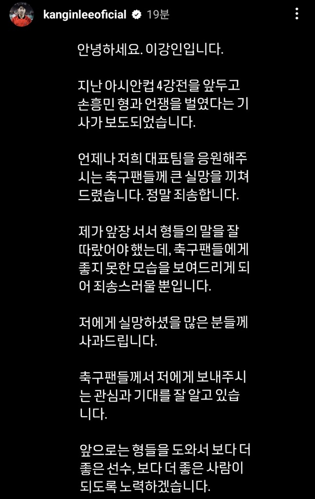 손흥민과 갈등을 직접 언급한 이강인은 "언제나 저희 대표팀을 응원해주시는 축구팬들께 큰 실망을 끼쳐드렸다. 정말 죄송하다"고 전했다. 이어 "축구팬들께서 저에게 보내주시는 관심과 기대를 잘 알고 있다"며 "앞으로는 형들을 도와서 보다 더 좋은 선수, 보다 더 좋은 사람이 되도록 노력하겠다"고 고개 숙였다.