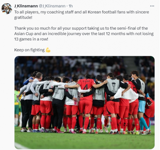 클린스만은 16일 SNS를 통해 "모든 선수와 코칭스태프, 그리고 모든 한국팬에게 진심으로 감사드린다. 지난 13경기 동안 패배 없이 놀라운 여정을 이어갈 수 있었다. 2023 아시아축구연맹(AFC) 아시안컵 준결승에 진출할 수 있도록 응원해주신 모든 분에게 감사하다! 앞으로도 화이팅해라"라고 작별인사를 남겼다.