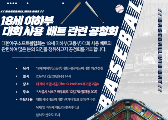 KBSA는 공식 홈페이지를 통해 이달 28일 오후 2시 서울 더 케이 호텔에서 '18세 이하 대회 사용 배트 관련 공청회'를 연다고 밝혔다. 이번 행사에서는 18세 이하 대회 비목재 배트 전환과 관련해 지도자, 선수, 학부모, 공인 업체 등 분야에 구애받지 않고 누구나 의견을 개진할 수 있다.