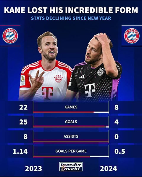 2024년이 되자 케인은 기량이 급격히 떨어졌다. 올해 그는 8경기 4골이라는 성적을 남기고 있다. 경기당 득점은 0.5골까지 하락했다. 스텟상으로는 큰 문제가 있는 건 아니지만 지난해에 비해 확연히 득점력이 떨어졌다.