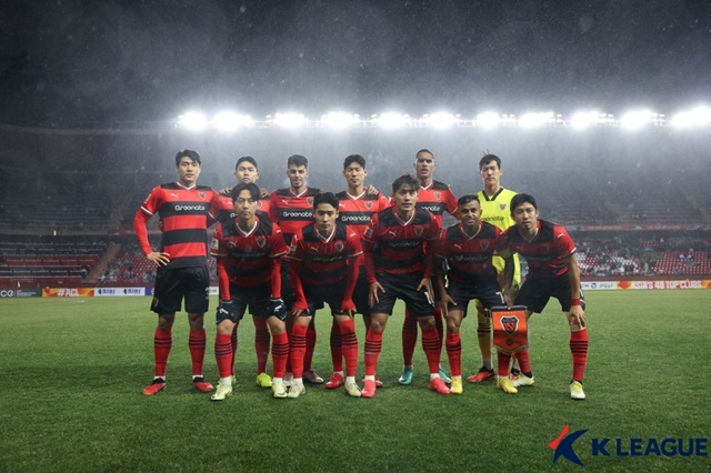 그런데 선취골을 뽑은 것은 포항이었다. 행운이 따른 선제골이었다. 전반 12분 수비수 박찬용이 먼 거리에서 중거리 슈팅을 날렸는데, 김정훈 골키퍼를 지나 그대로 골망을 흔들었다. 비가 내린 탓에 슈팅이 상당히 빠르게 날아갔다. 김정훈 골키퍼가 공을 잡으려는 모션을 취했지만, 제대로 처리하지 못했다. 박찬용의 슈팅 궤적도 워낙 좋았다. 김정훈 골키퍼는 상당히 아쉬워했다. 반면 박찬용은 포효했고 박태하 감독은 코치진을 끌어안으며 기뻐했다.