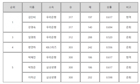 현역 선수 최다승 2위는 역시 우리은행 소속의 박혜진(34)으로, 486경기에서 300승 186패(승률 0.617)를 기록 중이다.