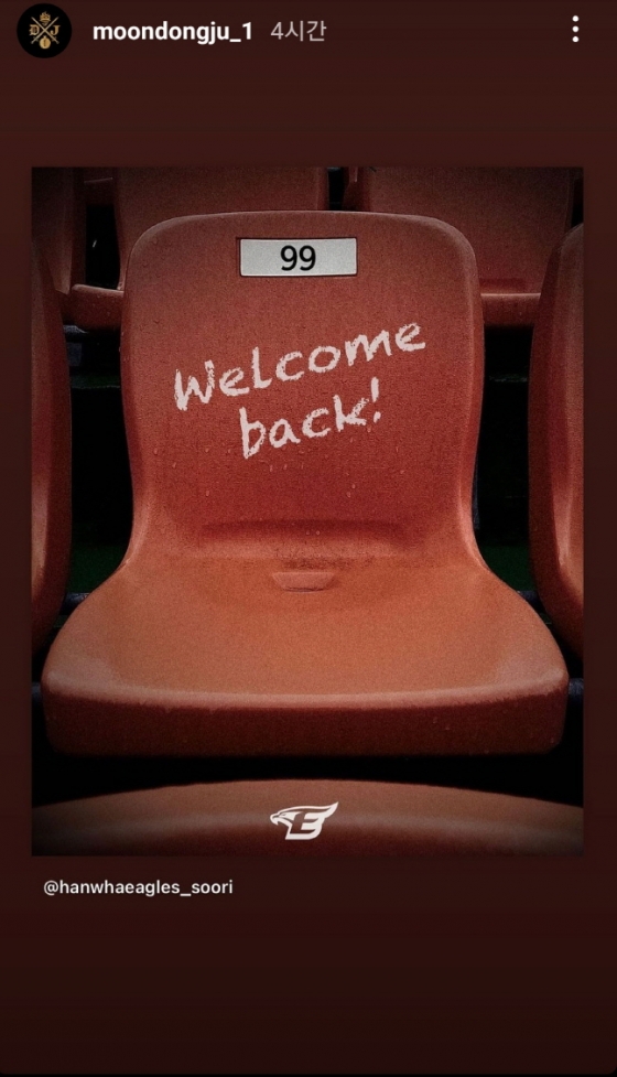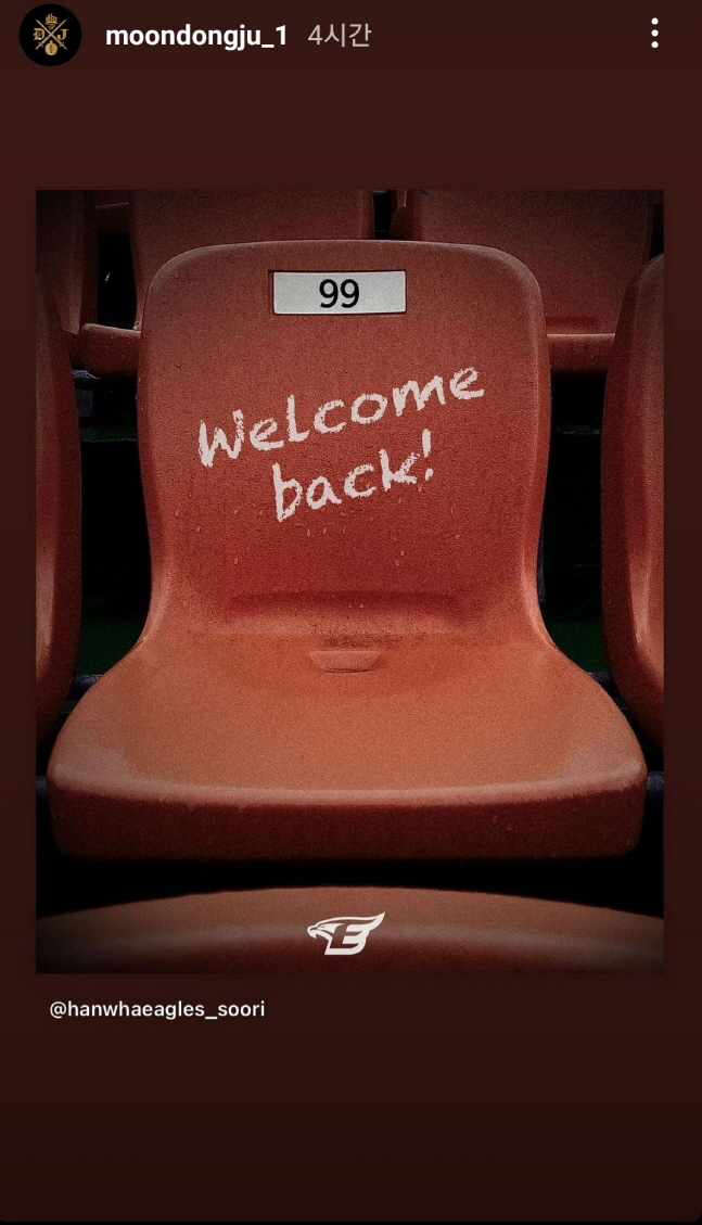 투수 직속 후배인 문동주(21)도 마찬가지였다. 그는 한화 이글스 공식 인스타그램에 업로드된 류현진의 복귀 기념 게시물을 재차 올렸다. 해당 게시물엔 한화 이글스를 상징하는 주황색 좌석에 류현진의 등번호인 99번이 새겨져있고 좌석 위로 "Welcome back(돌아온 걸 환영한다)!"이라고 적혀 있다.
