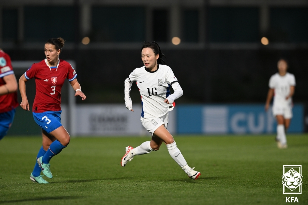전반 4분 만에 한국이 결정적인 기회를 맞았다. 최유리가 상대 뒷공간을 뚫어낸 뒤 오른발 슈팅으로 반대편 골문을 노렸다. 공은 왼쪽으로 살짝 비껴갔다. 비교적 신장이 높은 체코는 제공권을 활용해 한국을 공략했다.