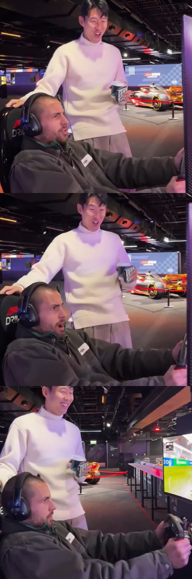 공개된 영상에서 손흥민은 화이트먼이 레이싱 게임 운전대를 잡자 "커먼 스키피! 커먼 스키피!(스키피 이겨라)"라고 소리치며 화이트먼의 게임 상대인 스킵을 응원한다. 이에 화이트먼은 아랑곳하지 않고 게임을 시작한다. 손흥민은 게임 화면을 바라보며 해맑게 웃는다. 천진난만한 미소가 눈길을 끈다.