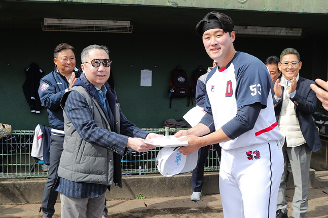 평소 야구 사랑으로 잘 알려진 박 구단주는 타격 훈련 등 선수단의 프로그램을 지켜본 뒤 이승엽 감독과 코칭스태프, 선수단과 일일이 악수하며 응원의 뜻을 전했다. 주장 양석환에게는 격려금도 전달했다.