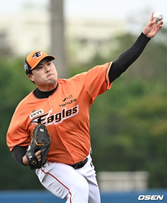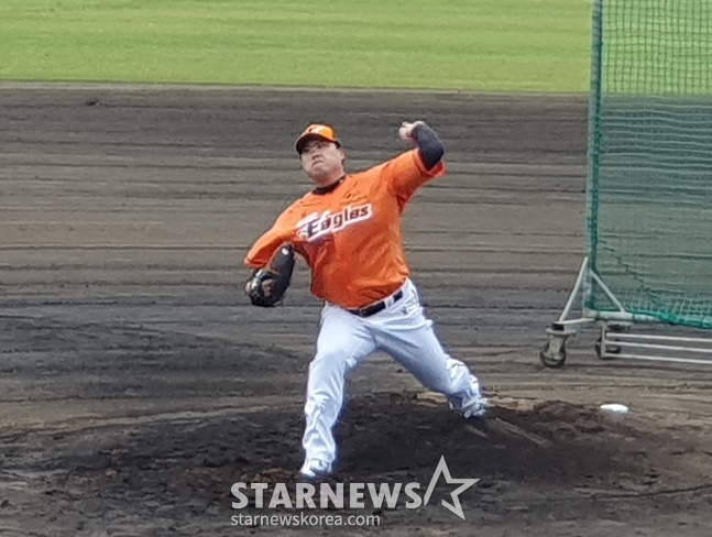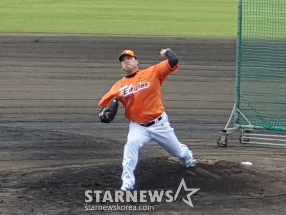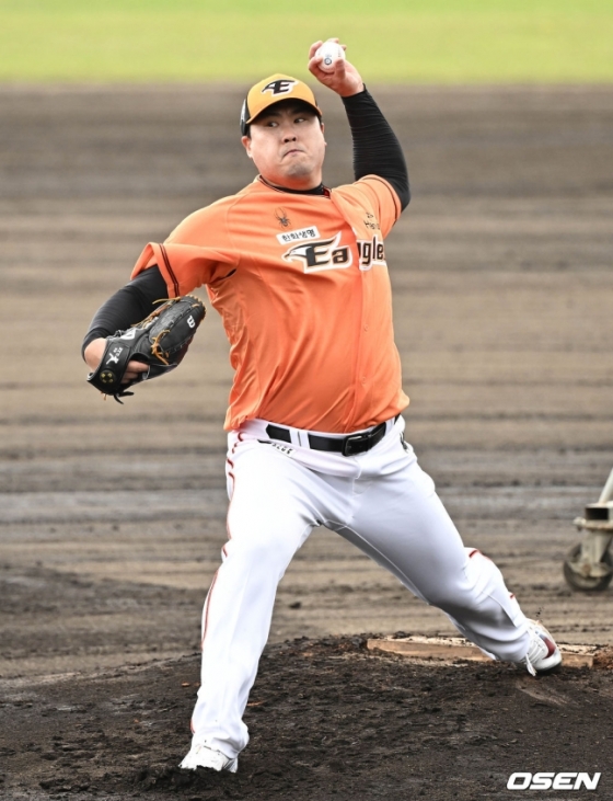 오전 11시 10분, 류현진은 마운드에 올라와 본격적인 투구에 나섰다. 포수 최재훈과 호흡을 맞춘 그는 김태연-이상혁-박상언-장규현을 상대로 피칭을 진행했다. 패스트볼과 커터, 커브, 체인지업 등 다양한 구종을 시험했다. 첫 턴에서 이상혁에게 몸쪽 패스트볼을 던지다 팔을 맞힌 것을 제외하면 대부분 스트라이크존 근처에서 탄착군이 형성됐다. 그는 약 30분 동안 65구를 던진 후 투구를 마감했다.