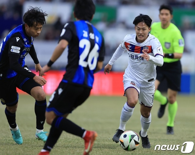 이후 양 팀은 치열한 중원 싸움을 펼치며 주도권을 잡으려고 했다. 이 가운데 인천이 조금씩 공격 기회를 늘렸다. 전반 33분 이명주의 결정적인 패스를 받아 홍시후가 페널티박스 안에서 찬스를 잡았다. 하지만 슈팅으로 연결하지는 못했다. 전반 37분 박승호의 프리킥 슈팅은 안준수 골키퍼가 막아냈다.