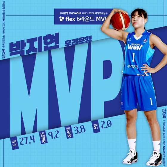 한국여자농구연맹(WKBL)은 4일 "우리은행 우리WON 2023~2024 여자프로농구 6라운드 MVP로 박지현이 선정됐다"고 발표했다. 박지현은 상금 200만 원을 받게 된다. 박지현의 라운드 MVP 수상은 지난 2020~21시즌 2라운드 이후 처음이다.